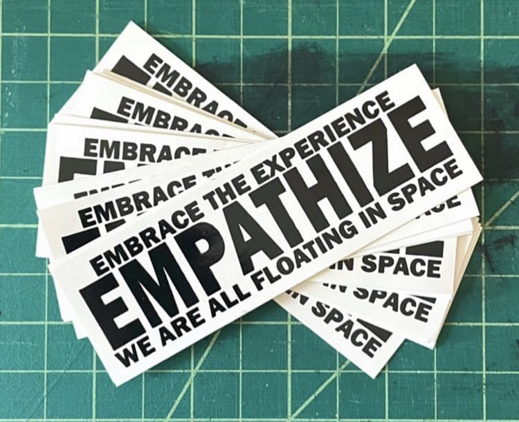Pack of 3 1.38" x 4.25" stickers that read: "EMBRACE THE EXPERIENCE. EMPATHIZE. WE ARE ALL FLOATING IN SPACE."